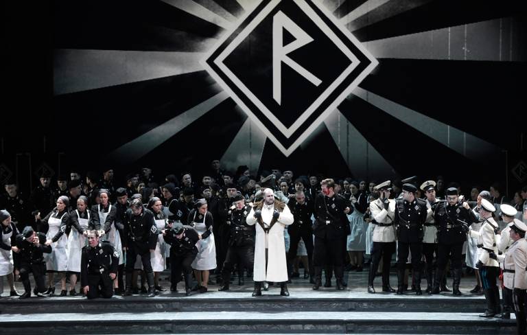 Considering that other attempts to represent Wagner with iconography based on the Nazi era have failed, even leading to their cancellation, this iconographic imitation with a runic R replacing the swastika, black uniforms, newsreels and the Irene-Magda Goebbels... I think the Berlin State Opera has succeeded in its experiment.