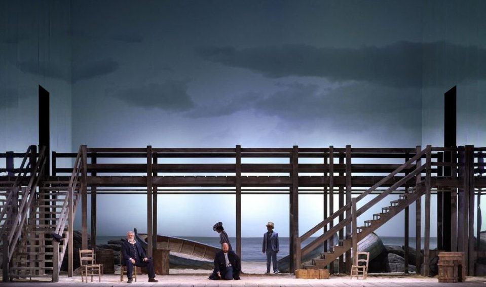 Hacía siete años que no se veía la obra del maestro Arrieta en el Teatro de la Zarzuela, después de una reposición en 2017. Ahora regresa en una nueva producción igualmente tradicional, pero de diferente estética, a cargo de Bárbara Lluch, quien adelanta la acción a principios del siglo XX, creando unas imágenes más propias de postales idílicas de una playa de vacaciones sacada de un cuadro de Sorolla, algo que parece reforzar el vestuario diseñado por Clara Peluffo. Si bien Marina es una enérgica joven aldeana, Jorge y Roque parecen sacados de la tripulación del mismísimo Titanic. Por no hablar del vestuario de Jorge y Pascual en la boda de este último, demasiado elegante para un astillero. El hecho de que veamos a los aldeanos con gente elegantemente vestida hace pensar que los turistas van para presenciar una boda de pueblo. O que la posición de los personajes es más elevada que en la historia original. La escenografía de Daniel Bianco es la misma para toda la obra: con el mar y el cielo recreados por animación y proyectados sobre el espejo, con arena en el escenario dando la sensación de estar en una playa real, presidida por un pasillo de madera. La animación y la recreación del cielo es estupenda.  El segundo acto muestra la misma plataforma de madera, pero dentro de la astillería.  La coreografía de Mercé Grané prevé unas danzas y una divertida pelea final. El montaje de Lluch podrá no ser tan fiel en ambientación, pero permite el entendimiento de la obra y su estética tradicional no molesta, incluso llega a agradar al público.